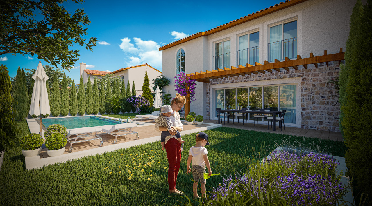 This project offers a life nested with nature with its garden areas. In our project, home owners will be able to collect their own olives and produce olive oil. In this way, home owners can experience this unique experimentation that cannot obtain in urban life by Project. In addition, our project will include ; Walking Paths Event Area Village Maidan Restaurant Main Swimming Pool Common Swimming Pool Aquapark Multi-purpose sports field (basketball, football, tennis) Barn & Coop BBQ Areas Olive Squeezing House / Rendering Plant Gym Children’s Park